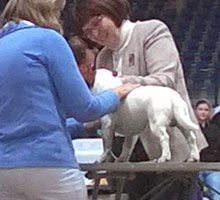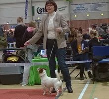 | Näyttely Seinäjoki 29.10.2011 KV Pentunäyttely Tuomari Peter Fodstad Norja Sievä pentu. Hyvin kehittymätön. Sievä, vahva otsa. Hyvä kaula. Hieman lyhyt runko. Hyvä luusto. Hieman lyhyt sääri. Koiran täytyy kantaa häntäänsä. Hyvässä kunnossa. Tarvitsee kehätottumusta. Rodunomainen lähestyttäessä 1 Pentuluokka 4 Vaasa KV 15.4.2012 Tuomari Marit Sunde Norja 1-vuotias, mukava tyyppi ja koko. Hyvä pää mutta aavistuksen pyöreät silmät. Etuasentoiset lavat. Hyvä runko. Hyvin kulmautunut takaosa. Liikkuu yhdensuuntaisesti takaa, ahtaasti edestä ja hieman uloskääntynein kyynärpäin. Hauska luonne. Rodunomainen lähentyessä 1 JUN EH Töysä Tuuri 10.6.2012 Tuomari Vesa Lehtonen Voimakas kokonaisuus. Hyvä pää, joka voisi kuitenkin olla kauttaaltaan hieman voimakkaampi. Hyvä kaula. Selkälinjan tulisi olla suorempi. Niukasti kulmautunut edestä ja takaa. Eturaajat tulisi olla suoremmat. Liikkuu tasapainoisesti, mutta hieman lyhyellä askeleella. Rodunomainen lähestäytyessä 1 JUN H Kokkola 8.7.2012 Tuomari Päivi Eerola Saisi olla raajakkaampi korkeuteensa nähden. Syvä rintakehä. Hyvä koko. Selvä sukupuolileima. Hyvä luusto. Kaunisilmeinen pää. Kauniit silmät ja korvat. Hyvä kaula ja häntä. Saisi liikkua yhdensuuntaisesti edestä. Hyvässä kunnossa. Hyvä karvapeite ja väri. Voisi pysyä paremmin ravissa. Kauniisti esitetty. JUN EH JUK 1 27.10.2012 Seinäjoki KV näyttely Tuomari Lindborg Mats Ruotsi Hieman pitkähkä. Hyvät raajat ja tassut. Aika hyvä pää. Oikea purenta. Erinomainen kaula ja lavat. Hyvä runko. Jyrkkä risti. Normaalit kulmaukset takaa, Hieman jyrkkä olkavarsi. Takaliikkeet voisivat olla vapaammat ja edestä kiinteämmät. Hyvä turkki. NUO EH NUK 2 Vaasa Botniahalli 14.4.13 Tuomari Persson Mona Ruotsi Erittäin hyvä tyyppi ja koko. Uroksen pää, jossa hyvä kuonon voima, aavistuksen poskekas. Hyvä kaula, hieman jyrkkä lapa, muuten hyvät kulmaukset. Hyvät käpälät. Hienot suorat eturaajat. Hieno rintakehä. hieman niukat takakulmaukset. Hieno turkki ja väri. Lyhyet ja sidotut liikkeet takaa, josta palkintosijoitus johtuu. Hieman varvasahdas edestä. AVO EH Alavus Töysä, Tuuri 9.6.13 Tuomari Tapio Ranta Melko hyvä rotutyyppiä oleva uros, jolla hyvä pää ja ilme. Hyvä rungon malli. Aavistuksen lyhyt olkavarsi. Hyvin kiinnittynyt häntä, kaartuu selälle. Selkälinjan toivoisin suoremmaksi. Liikkuu hieman leveästi edestä, takaa ok. AVO EH Honkajoki 7.7.2013 Tuomari Shankov Kostadin Bulkaria Riittävä tyyppi. Hampaat ja kivekset ovat normaalit. Riittävän tyypillinen pää. Hyvä kaula. Ei riittävän yhdensuuntaiset eturaajat. Ei riittävän oikea ylälinja, tarvitsee vielä enemmän lihaksia ja takakulmauksia. AVO H Vaasa Botniahalli 27.4.2014 Tuomari: Delmar Cathy, Ireland Hyvät silmät. Hyvä alaleuka. Pään tasapaino voisi olla parempi. Hyvä etuosa. Hyvä lapa. Hieman pitkä. Rintakehä voisi olla syvempi. Voimakas lanneosa. Hännänkiinnitys voisi olla korkeammalla. Toivoisin enemmän koiraa hännän taakse. Hyvät liikkeet. Ylälinja voisi olla parempi. Etuliikkeet voisivat olla paremmat. AVO ERI AVK 2 Maalahti 3.5.14 Tuomari: Ulltveit-Moe Annika, Sweden Kokonaiskuva karkea. Voisi olla sirompi naama. Korvat on hyvin asettuneet. Hyvä ilme. Vähän kaulanahkaa. Sopiva runko. Voimakkaat lihakset. Hyvä selkä ja kaulalinja. Vähän etupainoinen. Liikkuu hyvin takaa. Hyvä häntä. Vähän leveät kyynärpäät. AVO EH AVK 2 Seinäjoki 25.10.14 Tuomari: Finne Leni, Suomi Riittävät mittasuhteet. Sopiva luusto. Oikealinjainen pää. Hyvät tummat silmät. Oikea-asenteiset korvat. Hyvä kaula ja ylälinja. Niukahko eturinta. Lyhyt olkavarsi. Hieman käyrät eturaajat. Löysät kyynärpäät. Oikeanmallinen rintakehä. Hieman jyrkkä lantio. Tiivis, hieman pehmeä karvapeite. Taka-askel sais olla tehokkaampi. AVO EH Kurikka 25.7.15 Tuomari: Markku Kipinä Turhan raskas runko. Hyvänkokoinen vahvaluustoinen uros. Hyväilmeinen pää. Hyvät korvat, silmät ja purenta. Hyvä kaula. Ylälinja saisi olla tiiviimpi. Hyvä häntä. Hieman jäykkä taka-askel. Löysyyttä edessä. Hyvä luonne. AVO EH AVK 2 Vaasa KV INT 2015 Tuomari: DE Cuyper Jos Belgium 4-vuotias Hyvä tyyppi, hyvä pää. Urosmainen, oikeanlaiset korvat. Hyvä kaula, hyvä ylälinja. Hyvä hännän kiinnitys. Syvä rintakehä. Liian pyöreä rintakehä. Hyvin kulmautunut. Oikeanlainen luusto. Hyvät tassut. Oikeanlaiset liikkeet. AVO ERI AVK 3 |